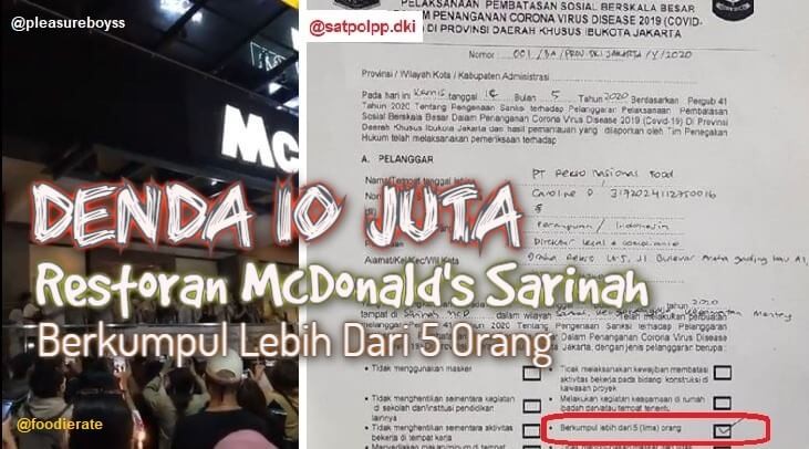 Karenanya, per tanggal 14 Mei 2020, pihak restoran McDonald’s telah dipanggil oleh satpol pp Jakarta dan telah membayarkan denda administrative pelanggaran PSBB sebesar Rp 10 juta.