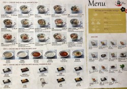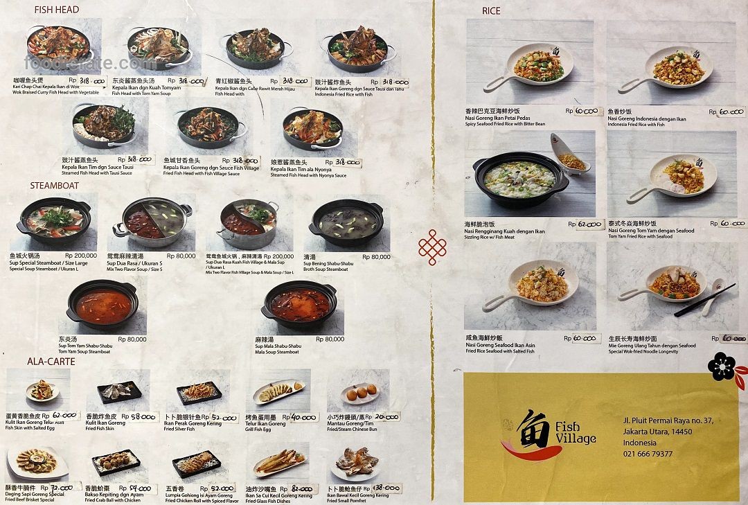 "Di sini makanan utamanya berupa sup ikan, yang bisa dikombinasikan dengan nasi, bubur, atau mie/bihun/kwetiaw. Topping isi supnya bermacam-macam seafood, utamanya: ikan, daging ikan fillet, kulit ikan goreng, ikan goreng fillet, kepala ikan, kerang, scallop, udang, kepiting, bakso ikan, jamur, sayuran. Untuk menu Fish Village Special, dapat topping lebih banyak jenis, ada: bakso, udang, ikan. Supnya bisa milih: sup bening, sup spesial fish village, sup merah tom yum, atau sup pedas sze chuan. Untuk mie kuning, bisa milih: mie chinese (ifumie) atau mie jenis indonesia (mie telur). Kuah ikannya enak, kental, terasa banget kuahnya. Ikannya terasa segar banget. Bakso ikannya beda, lembut banget tekstur baksonya, terasa seperti: tofu."