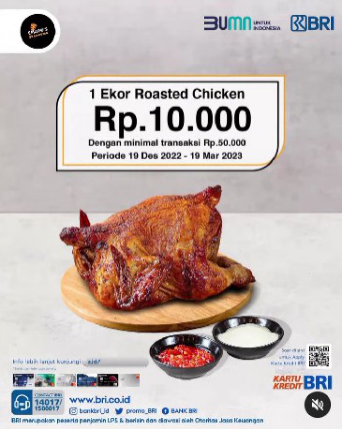 - Promo bisa beli 1 ekor roasted chicken hanya Rp. 10.000 untuk pembayaran dengan kartu kredit BRI dengan minimal transaksi Rp. 50.000.