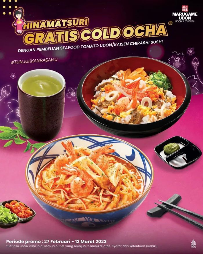- Promo gratis cold ocha berlaku untuk setiap pembelian menu terbaru Marugame Udon Seafood Tomato Udon dan Kaisen Chirashi Sushi.