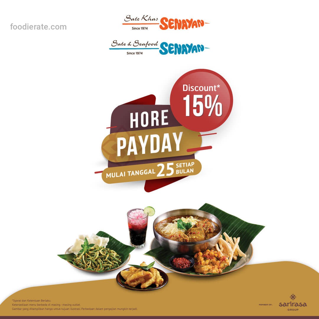 <p><b>PROMO HORE PAYDAY SATE KHAS SENAYAN DAN SATE & SEAFOOD SENAYAN </b></p><p>Dapatkan diskon 15% mulai tanggal 25 setiap bulan untuk menu pilihan Sate Khas Senayan dan Sate & Seafood Senayan berikut:</p><p><br></p><p>1. Tanggal 25: Es Cendol, Pisang Goreng, Sayur Asem, Kerupuk Ikan Bakar, Dendeng Ragi.</p><p>2. Tanggal 26: Sudang Lepet Sambal Matah, Wedang Ronde, Kroket, Keripik Tempe Manis, Nasi Kuning Campur Vegetarian.</p><p>3. Tanggal 27: Paru Sambal Bawang, Dadar Gulung (Gula Merah/Nangka), Plecing Kangkung, Kerupuk Udang, Lontong Campur (Vegetarian).</p><p>4. Tanggal 28: Ayam Gerang Asem, Risoles, Kerupuk Gendar, Terong Sambal Bawang.</p><p>5. Tanggal 29: Ketoprak, Es Cendol, Keripik Tempe Asin, Sosis Solo, Ayam Betutu.</p><p>6. Tanggal 30: Es Cincau, Sayur Lodeh, Sayap Goreng Lengkuas, Pastel, Rempeyek.</p><p>7. Tanggal 31: Kacang Panjang Khalas, Klepon, Combro, Kerupuk Paru, Nasi Goreng Cakalang.</p><p><br></p><p><b>Syarat dan Ketentuan :</b></p><p>1. Berlaku setiap bulan, mulai tanggal 25 sampai tanggal terakhir di bulan tersebut (termasuk hari besar/libur nasional).</p><p>2. Diskon berlaku untuk menu berbeda di setiap tanggal.</p><p>3. Hanya untuk makan di tempat.</p><p>4. Berlaku untuk semua jenis pembayaran kecuali voucher complimentary.</p><p>5. Tidak dapat digabungkan dengan promosi lainnya.</p><p>6. Sisa produk promo tidak dapat dibawa pulang.</p><p>7. Ketersediaan menu mungkin berbeda di beberapa cabang.</p>