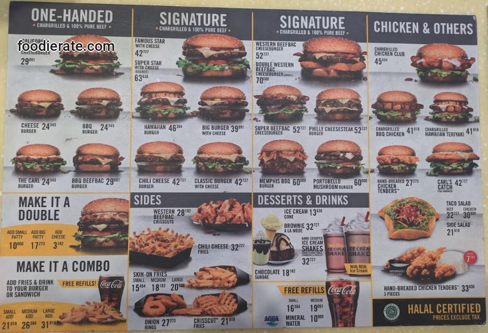 "Burger termurah di Carl's Jr adalah The Carl Burger. Ukuran burger termasuk yang paling kecil, dengan isian: daging patty burger dan sayuran. Rasa burger di Carl's Jr memang mantap. Walaupun ini burger sederhana, namun rasa burgernya enak. Burger ini lagi promo lho, jadi harganya super murah hanya 15 ribu saja."