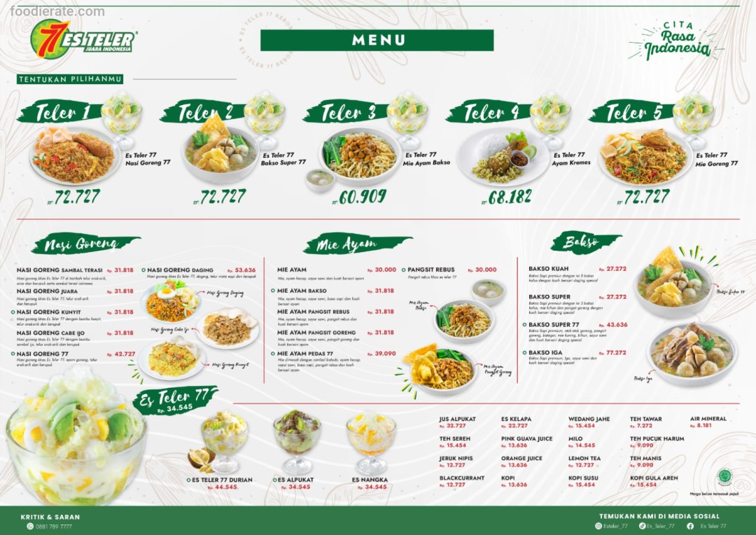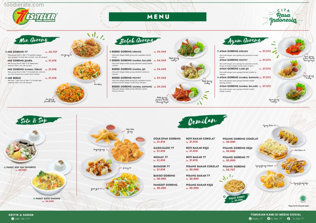 "Es teler 77, es teler dari jaman dulu, tetap terenak. Es teler di sini isinya buah-buahan, kelapa, nangka, alpukat. Jika mau hanya isian 1 macam buah juga bisa, seperti: es teler khusus hanya isi alpukat atau hanya isi nangka."