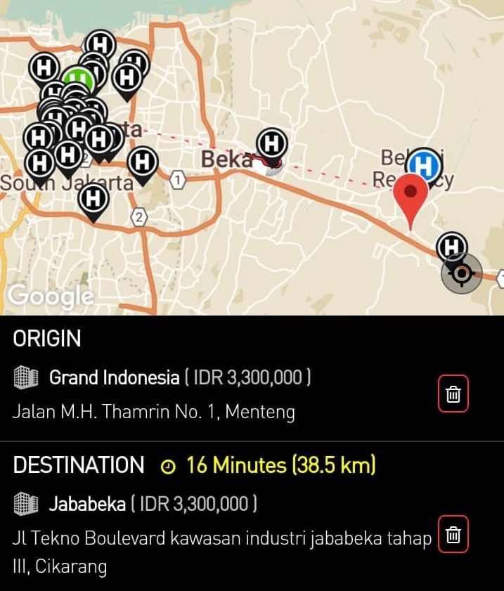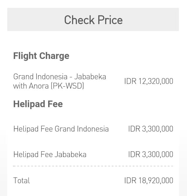 Sebagai gambaran biayanya, jika pesan pesawat heli untuk tujuan Jakarta-Cikarang, maka titik berangkatnya adalah sebagai berikut: