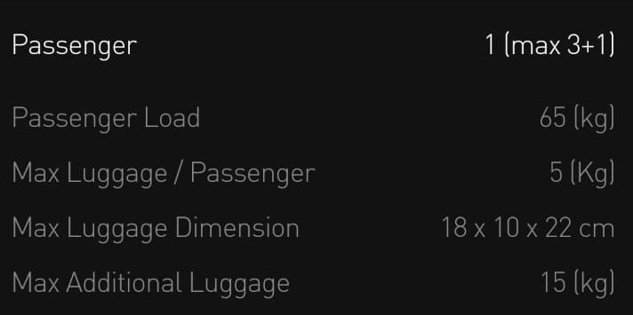 Berat per penumpang diperkirakan sebesar 65 kg (dengan kapasitas 3+1 penumpang), dengan maksimum bagasi 5 kg per orang. Maksimal ukuran bagasi adalah sebesar 18 x 10 x 22 cm, dengan total maksimum tambahan bagasi 15 kg per pesawat secara keseluruhan (untuk jenis heli 3+1 orang).