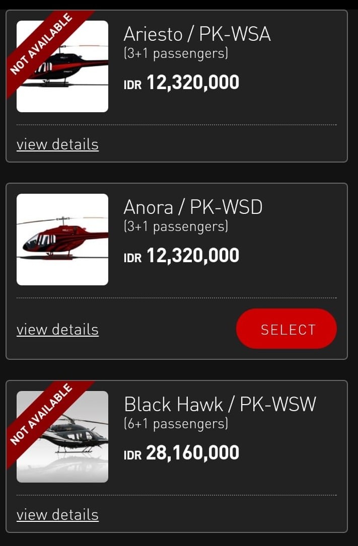 Ada 2 jenis heli yang bisa dipilih, yaitu heli kecil dengan kapasitas 3+1 orang (heli Ariesto atau heli Anora), dan ada heli yang lebih besar dengan kapasitas 6+1 orang (heli Black Hawk). Biaya per kali booking pesawat heli dihitung per pesawat beserta biaya landasan di area lepas landas dan area tempat mendarat.