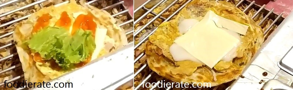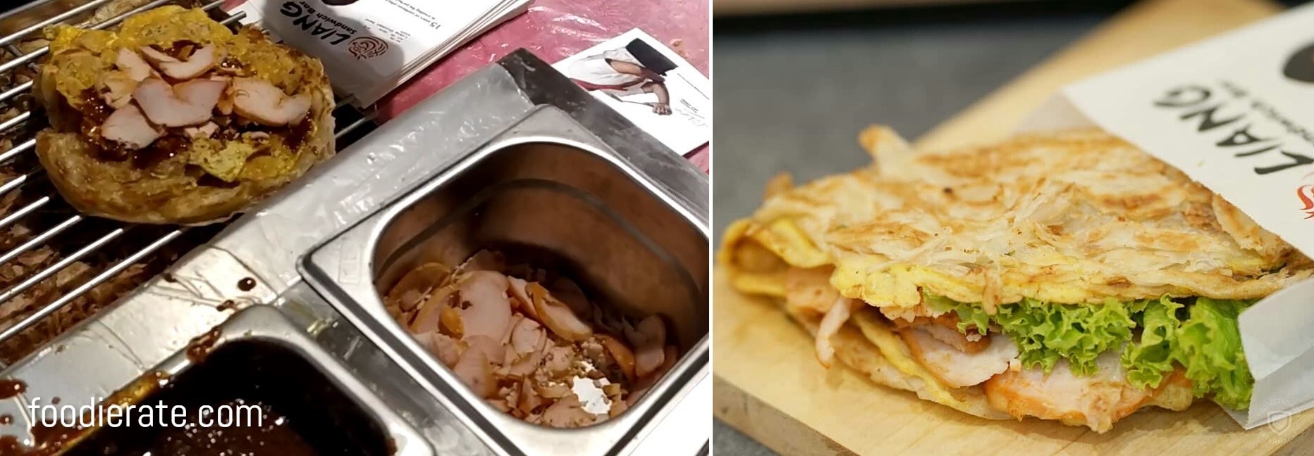 1. Sandwich-nya menggunakan ROTI PRATA (Scallion Pancake), bukan roti biasa.