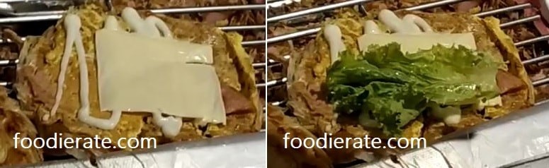 Topping telur dan chicken ham dipanggang bersama dengan kulit sandwich, kemudian dibalur dengan cheese sauce, baru di-topping dengan cheese dan sayur selada.