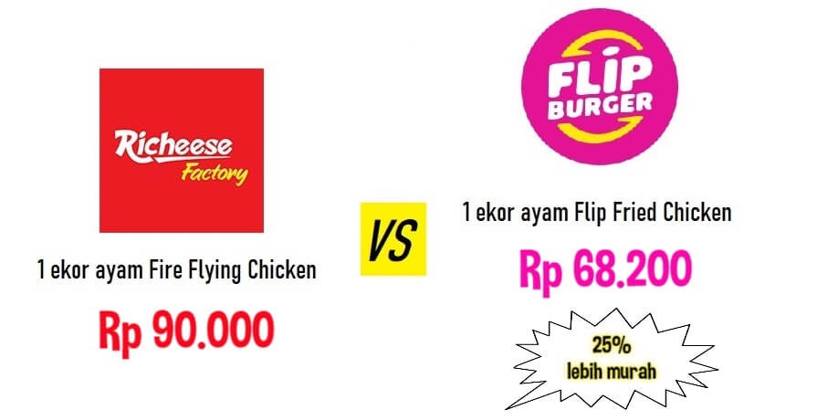 Harga 1 ekor ayam Flip Burger lebih murah 25% daripada harga 1 ekor Richeese Factory – Rp 68.200 berbanding Rp 90.000 per ekor, sehingga dengan Rp 200 ribu-an bisa membeli 3 ekor ayam di Flip Burger, sementara di Richeese Factory hanya bisa membeli 2 ekor ayam.