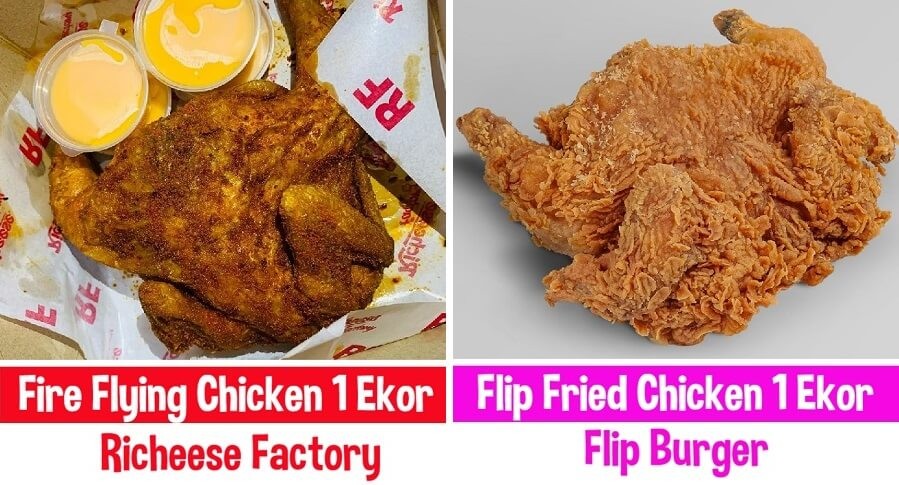 Ayam 1 ekor Richeese Factory dan Flip Burger sama-sama memiliki ukuran ayam yang besar.
