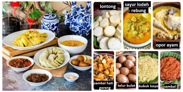 Lontong cap go meh berisi: lontong, opor ayam, sayur lodeh, sayur rebung, telur bulat, bubuk koya/kedelai, dan sambal goreng hati pedas, sambal godok pedas, kerupuk.