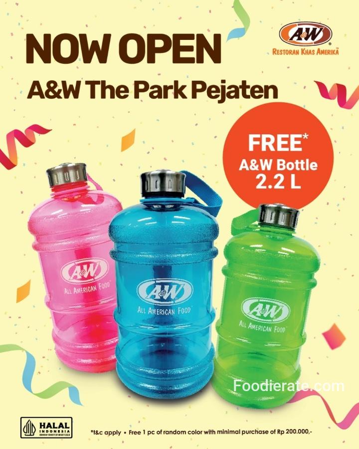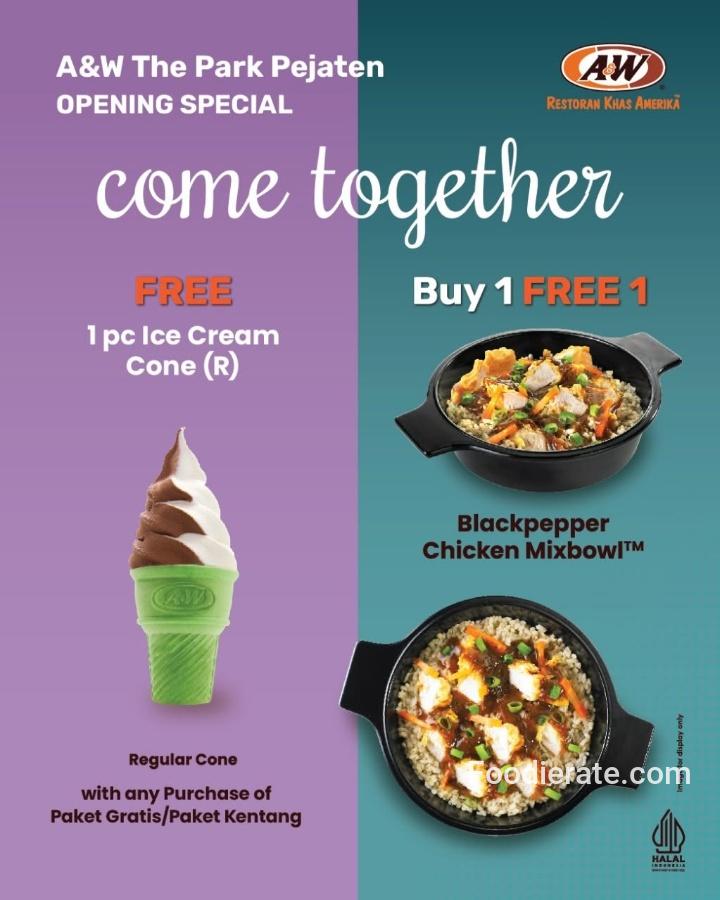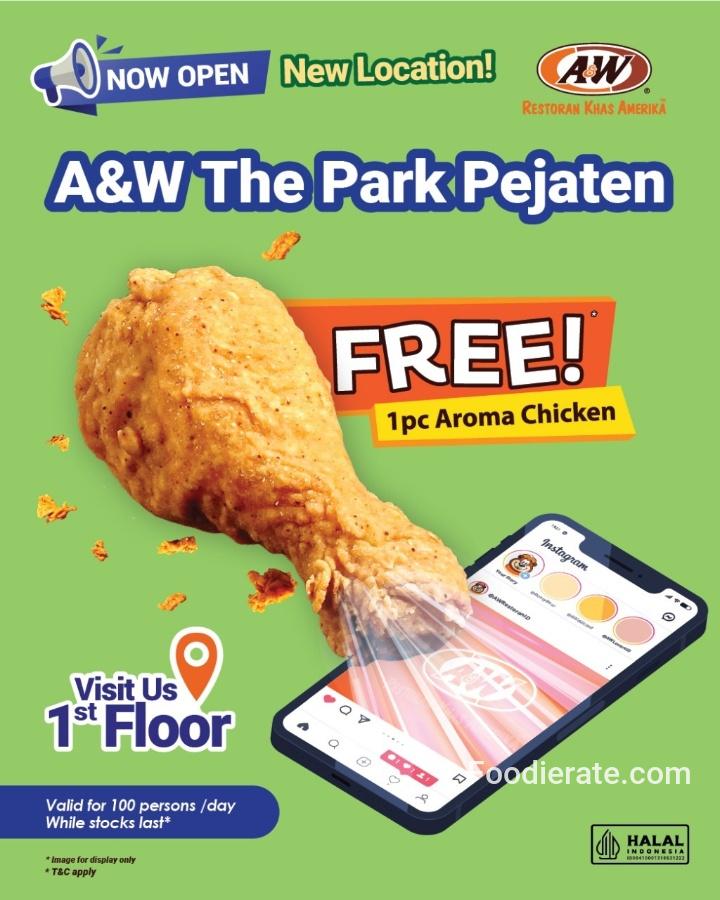 Promo hanya berlaku di A&W The Park Pejaten yang kini telah relokasi ke lantai 1. Tersedia hadiah gratis seperti Golden Aroma Chicken, Ice Cone, dan RB Bottle 2.2L, serta promo Buy 1 Get 1 Blackpepper Chicken Mixbowl™.