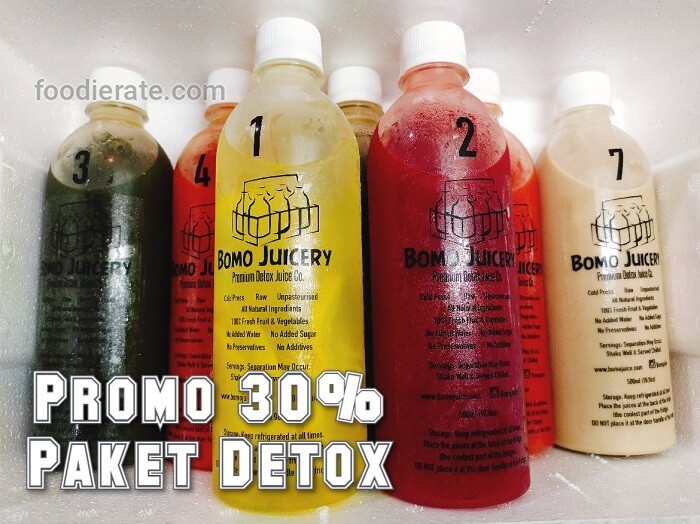 <p><b>Jenis Promo</b>: Promo Bomo Juicery Paket Detox </p><p><span style="font-family: "Helvetica Neue", Helvetica, Arial, sans-serif;"><b>Harga Promo</b>: Rp 239.000</span><br></p><p><span style="font-family: "Helvetica Neue", Helvetica, Arial, sans-serif;"><b>Harga Normal</b>: Rp 329.000</span><br></p><p><span style="font-family: "Helvetica Neue", Helvetica, Arial, sans-serif;"><b>Diskon</b>: 30%</span><br></p><p><span style="font-family: "Helvetica Neue", Helvetica, Arial, sans-serif;"><b>Menu on Promo</b>: Paket Reset Detox</span></p><p><span style="font-family: "Helvetica Neue", Helvetica, Arial, sans-serif;">Paket berisi 8 botol @ 250 ml:</span><br></p><p>1: Detox Water: US lemon, mountain rock salt</p><p>2: Multi-Enzymes: swiss chard, romaine lettuce, cucumber, apple, Korean pear, US lemon</p><p>3: Blood Vitamin: beetroot, US lemon, Thai pineapple, Korean pear, Mexican chia seeds</p><p>4: Toxin Flush: baby watermelon, Korean pear, apple, US lemon</p><p>5: Green Protein: kale, cucumber, apple, Korean pear, US lemon, Thai pineapple</p><p>6: MultiVitamin: carrot, sunkist orange, apple, Korean pear, baby watermelon, Thai pineapple, US lemon</p><p>7: Essential Vitamin: almond, cashew, green tea, US dates, mountain rock salt</p><p>8: Teatox</p><p><br></p><p><b>Syarat dan Ketentuan</b>:</p><p>Pesan H-1 ke no telp/WA 081380991758</p>