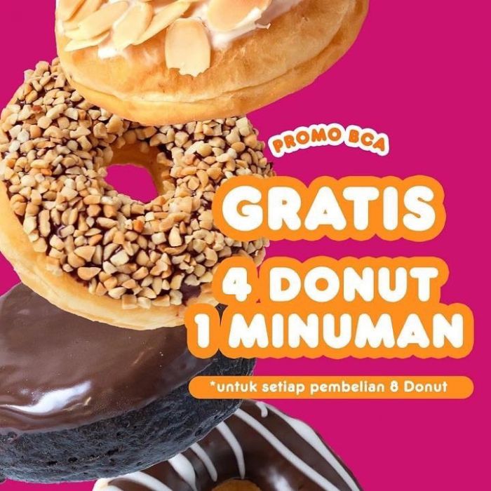 - Promo gratis 4 Donut 1 Minuman untuk setiap pembelian 8 donut.