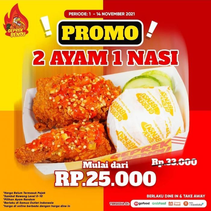 <p><b>Syarat dan Ketentuan</b>:</p><p>1. Promo berlaku untuk paket OMG</p><p> OMG1: 2 Ayam 1 Nasi - Rp 25.000</p><p> OMG2: 3 Paket Geprek Bensu Rp 45.455<br></p>