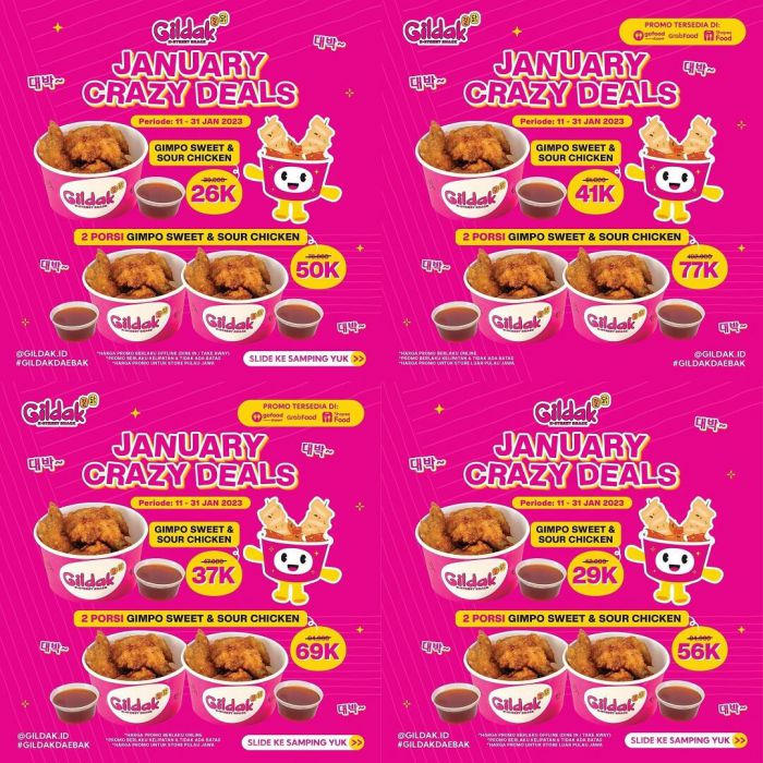 <p><b>Promo Gildak January Crazy Deals</b></p><p><b>Menu Promo Bulan Januari 2023 Gildak:</b></p><p><b>1. Dimpo Sweet & Sour Chicken </b></p><p><b>Harga offline (dine-in & takeaway) - cabang Pulau Jawa:</b></p><p>Harga Promo: 26.000</p><p>Harga Normal: 39.000</p><p>Diskon: 33%</p><p><br></p><p><b>Harga offline (dine-in & takeaway) - cabang luar Pulau Jawa:</b></p><p>Harga Promo: 29.000</p><p>Harga Normal: 42.000</p><p>Diskon: 31%</p><p><br></p><p><b>Harga online (delivery GoFood, GrabFood, ShopeeFood) - cabang Pulau Jawa:</b></p><p>Harga Promo: 37.000</p><p>Harga Normal: 47.000</p><p>Diskon: 22%</p><p><br></p><p><b>Harga online (delivery GoFood, GrabFood, ShopeeFood) - cabang luar Pulau Jawa:</b></p><p>Harga Promo: 41.000</p><p>Harga Normal: 51.000</p><p>Diskon: 20%</p><p><br></p><p><b>2. 2 Porsi Gimpo Sweet & Sour Chicken</b></p><p><b>Harga offline (dine-in & takeaway) - cabang Pulau Jawa::</b></p><p>Harga Promo: 26.000</p><p>Harga Normal: 39.000</p><p>Diskon: 33%</p><p><br></p><p><b>Harga offline (dine-in & takeaway) - cabang luar Pulau Jawa::</b></p><p>Harga Promo: 56.000</p><p>Harga Normal: 84.000</p><p>Diskon: 33%</p><p><br></p><p><b>Harga online (delivery GoFood, GrabFood, ShopeeFood) - cabang Pulau Jawa:</b></p><p>Harga Promo: Rp 37.000</p><p>Harga Normal: Rp 47.000</p><p>Diskon: 22%</p><p><br></p><p><b>Harga online (delivery GoFood, GrabFood, ShopeeFood) - cabang luar Pulau Jawa:</b></p><p>Harga Promo: 50.000</p><p>Harga Normal: 78.000</p><p>Diskon: 26%</p>