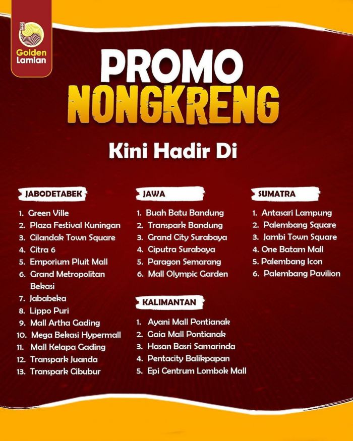 - Special Promo dari Golden Lamian: Paket Golden Lamian Nongkreng untuk Paket Bertiga mulai dari Rp 90 ribu-an.