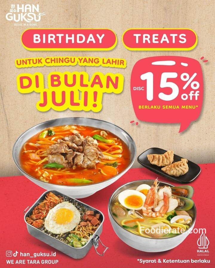 Promo ulang tahun ini hanya berlaku bagi pelanggan yang berulang tahun di bulan Juli. Diskon 15% dapat dinikmati dengan menunjukkan KTP dan melakukan pembelian minimal Rp150.000 sebelum pajak dan layanan. Ajak teman untuk rayakan momen spesial ini di Han Guksu.