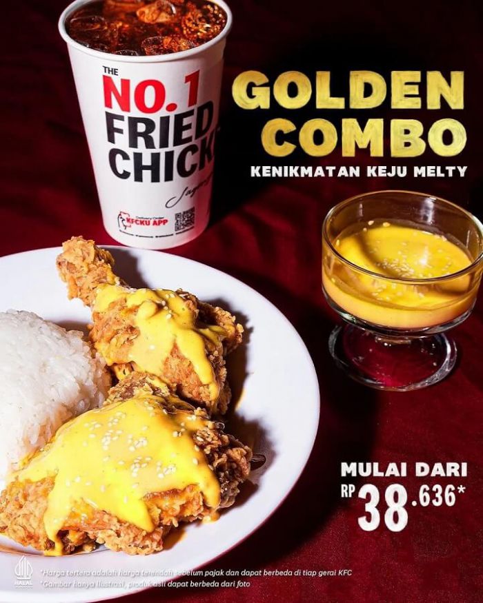- Promo berlaku untuk menu GOLDEN COMBO 1 1 Hot & Cheesy Chicken + 1 Nasi + 1 Coca-Cola Regular / Float Rp 38.636, GOLDEN COMBO 2 2 Hot & Cheesy Chicken + 1 Nasi + 1 Coca-Cola Regular Float Rp 56.818, Hot & Cheesy Chicke Rp 22.727 per pcs.