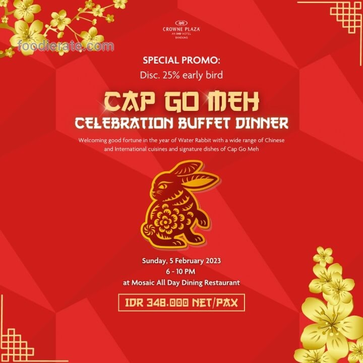 - Promo diskon early bird 25% untuk reservasi lebih awal sebelum makan malam Cap Go Meh pada Minggu, 5 Februari 2023 jam 6-10 malam di Mosaic Restaurant - Crowne Plaza Hotel Bandung.