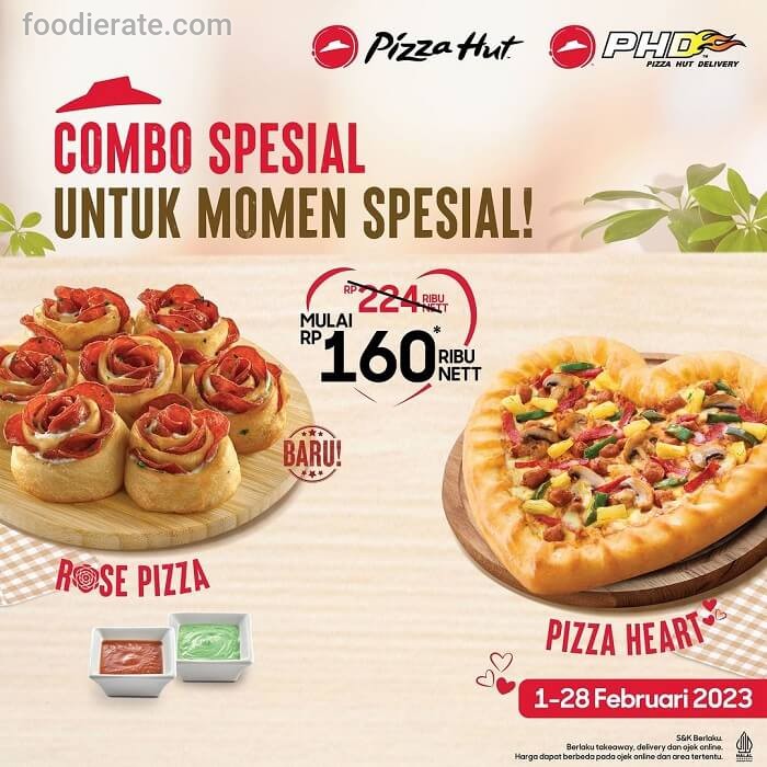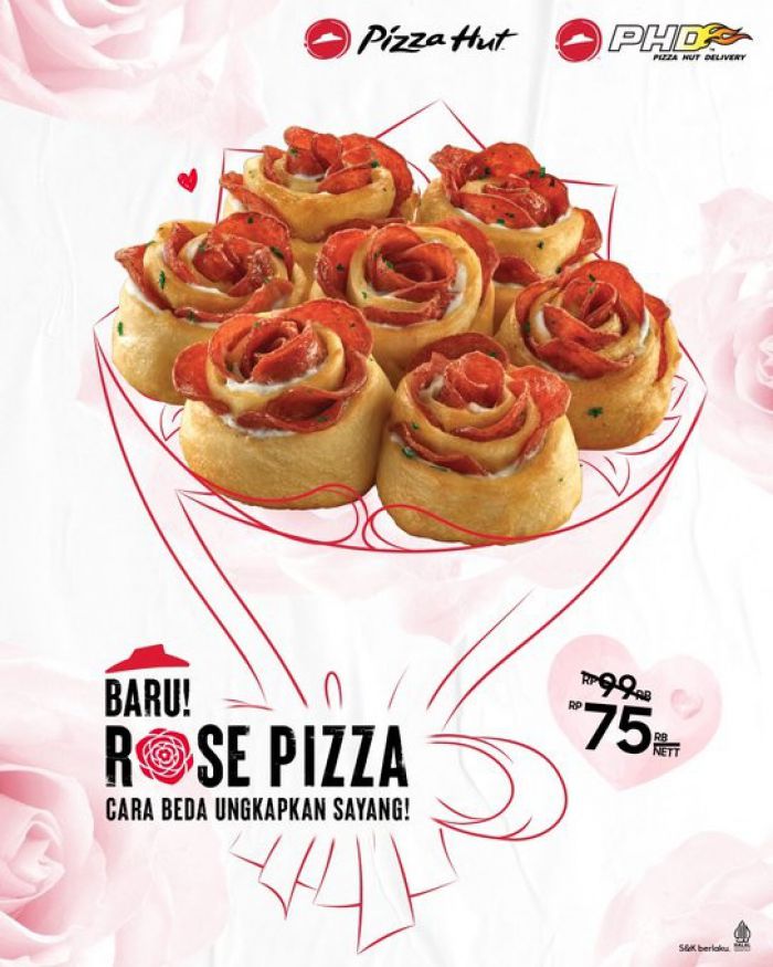 - Promo Valentine 2023 Pizza Hut : 7 pcs Rose Pizza hanya seharga Rp 75.000 net (diskon 25% dari harga normal = Rp 99.000) dan Promo Combo Spesial 7 pcs Rose Pizza + 1 Pizza Heart hanya seharga Rp 160.000 (diskon 29% dari harga normal = Rp 224.000).