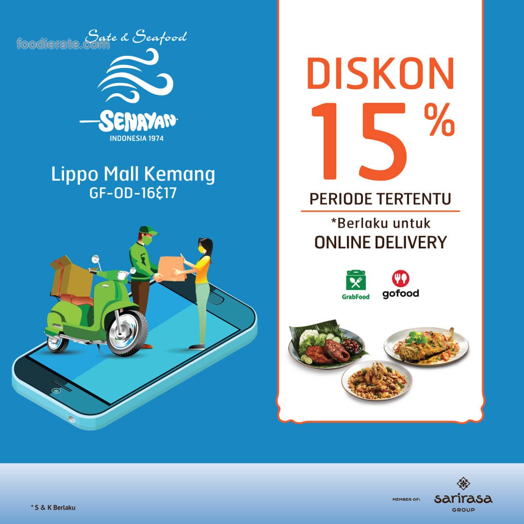 <p><b>Promo DISKON 15% ONLINE DELIVERY UNTUK PEMBELIAN DI SATE & SEAFOOD SENAYAN, LIPPO MALL KEMANG</b></p><p>Diskon 15% untuk pembelian semua menu di Sate & Seafood Senayan, Lippo Mall Kemang khusus pemesanan melalui online delivery.</p><p><br></p><p><b>Syarat dan Ketentuan :</b></p><p>1. Periode : 24 Januari - 6 Februari 2023 .</p><p>2. Berlaku untuk semua menu.</p><p>3. Promo berlaku setiap hari selama jam operasional.</p><p>4. Berlaku di GrabFood dan GoFood.</p><p>5. Promo tidak dapat digabungkan dengan promo lainnya.</p><p>6. Promo hanya berlaku di Sate dan Seafood Senayan cabang Lippo Mall Kemang.</p>