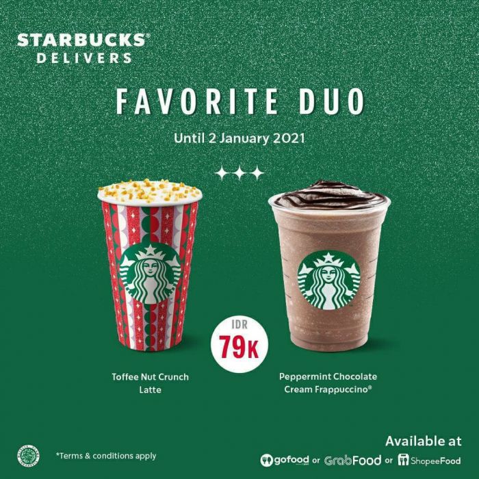<p><b>Syarat dan Ketentuan</b>:</p><p>1. Promo berlaku untuk 2 minuman Starbucks Toffee Nut Crunch Lattee dan Peppermint Chocolate Cream Frappucinno.</p>