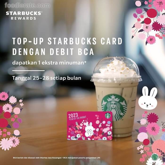 - Promo GRATIS minuman ukuran Tall untuk pilihan semua variants minuman di Starbucks untuk setiap top up Starbucks Card minimum Rp200.000 dengan menggunakan semua jenis Debit BCA Chip.