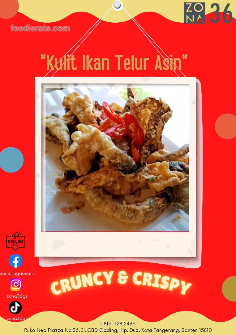 Hi Sobat Gading Serpong, Buat sobat yang suka Cemal Cemil , pasti tidak asing untuk menu yang satu ini : Kulit Ikan Telur Asin alias Fish Skin Salted Egg , Bisa dijadikan camilan ataupun lauk...rasanya kriuk kriuk gurih . Jangan sampe kehabisan yah Sob , langsung meluncur yuks.. Zona36 +62 819-1128-2436 Ruko Neo Piazza No.36, Jl. CBD Gading, Klp. Dua, Kota Tangerang, Banten 15810