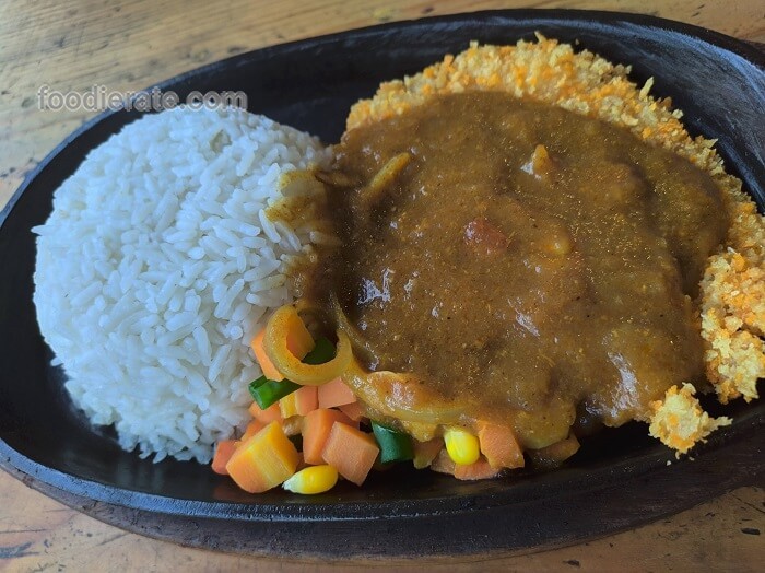 Isinya katsu ayam sebesar potongan steak, disiram sama saus kari dan topping-an sayur-sayuran (wortel, jagung), dan dapat 1 nasi.
