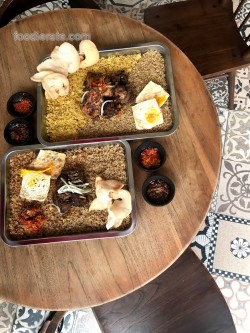Lagi berada di area Kemang dan sedang ingin makan berempat nih biar irit, boleh dicoba set menu di restoran Alahap Jakarta. Set menu yang bisa dinikmati berempat ini isinya: Nasi goreng Tersedia tiga pilihan : nasi kebuli, nasi rempah dan nasi gulai. Dabba (daging kambing yang sudah dibumbui) dan ayam 2 telor ceplok kerupuk udang 2 sambal matah dan sambal merah Seporsi pangsit dabba Seporsi samosa keju 1 L air mineral. Untuk set menu, bisa kalian pilih yang mix daging kambing dan ayam atau mau daging kambingnya saja. Saya mencoba nasi rempah dan nasi gulai, dan lebih cucok sama yang nasi gulai. Bumbunya okeh tidak terlalu menyentak dan saya lebih suka yang sepert ini. Untuk daging kambing, jangan kuatir, sama sekali tidak tercium bau tidak enak. Bumbunya juga sudah meresap di daging, empuk pula pas dimakan. Apalagi dengan sambal matahnya, lebih enjoy lagi pastinya.