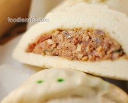 Bakpao babi cincang (minced pork bun) berisikan: daging babi cincang dicah dengan sesame oil dan bawang bombai.
