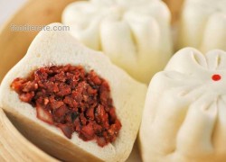 Bakpau babi merah (BBQ pork bun) berisikan: daging babi merah (daging babi BBQ chasiu merah).