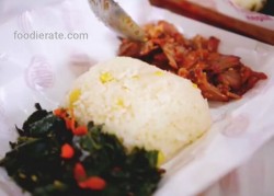 Paket Nasi berisi: Nasi Jagung / Nasi Putih, Sei Sapi Asap (40 gram), Sayur Daun Singkong, Lemon Grass Tea, dan Saus Sesuai Pilihan.