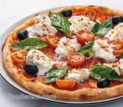 Buratta mozzarella and basil torn over a baked Pizza topped with olives and cherry tomatoes Drizzle with chili oil