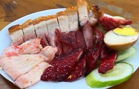 Daging Campur Spesial berisi: daging babi merah (siobak), daging babi panggang (samcan), atam, dan telur kecap. Porsi dagingnya cukup banyak. Dagingnya enak, empuk, dan garing.