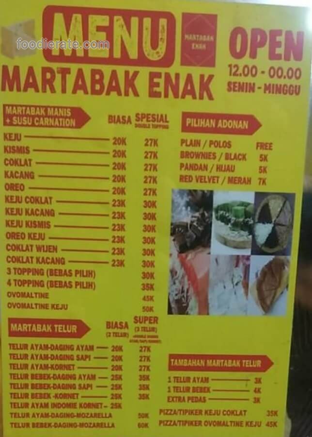 Nama tempatnya: Martabak Enak - gampang diingat! Yang terutama, harganya murah - jadi bisa sering-sering jajan martabak. Harga 20 ribu-an dapat makan martabak enak. Harga martabak yang 3 telur juga murah dan terjangkau. Mau daging ayam atau sapi, harganya sama. Bisa sering-sering jajan yang daging sapi - hanya 20 ribu lho - dengan 2 telur - MURAH MERIAH !!