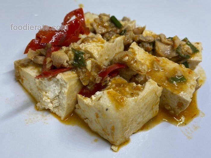Makanannya berupa 1 balok tahu, dipotong menjadi bagian kecil-kecil. Tahu-nya tahu putih. Ada banyak topping ayam cah sichuan. Rasanya pedas. Untuk rasa - termasuk enak. Porsi masakannya juga besar, karena dapat 1 balok tahu putih besar penuh. Kalau buat makan sendiri, cukup banget lauknya, bahkan bisa ada sisa buat bungkus pulang. Harganya termasuk worth it, 28 ribu.