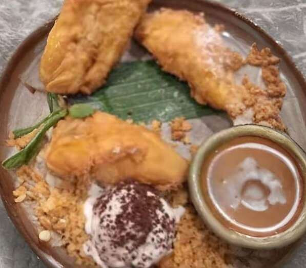 Pisang gorengnya beda sama yang biasa, ini dapat 3 pisang goreng, es krim, cookies, sama saus cocolan coklat.