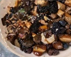 Di sini ada ditaburi daun bawang warna hitam (daun bawang yang digoreng gosong hingga berwarna hitam).