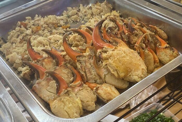 Bakmie Yam Kepiting: ini menu bakmie yang ada topping kepitingnya. Isinya: 3 capit, taburan cacahan daging kepiting, fish cake, shrimp cake, bakso ikan, daging nani. Daging peitingnya segar. Direbus dan manis rasanya. Asli manisnya langsung dari daging kepitingnya langsung. Bakmie-nya jenis bakmie kecil yang enak. Topping kaya shrimp cake enak banget.