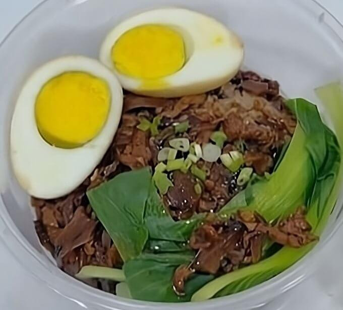 Nasi babi Taiwan berisi: nasi dengan 3 lauk: babi cah jamur, telur kecap, dan sayur bokcoi cah. Porsinya besar. Nasinya banyak. Lauk babi cah jamurnya banyak. Telur kecap dapat 1 butir. Sayur bokcoi dapat lumayan banyak. 3 lauk ditambah ada kuah kaldu yang enak banget disiram ke nasi.